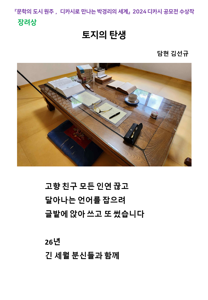 본 작품은 문학의 도시 원주, 디카시로 만나는 박경리의 세계 2024년 디카시 공모전 수상작입니다.